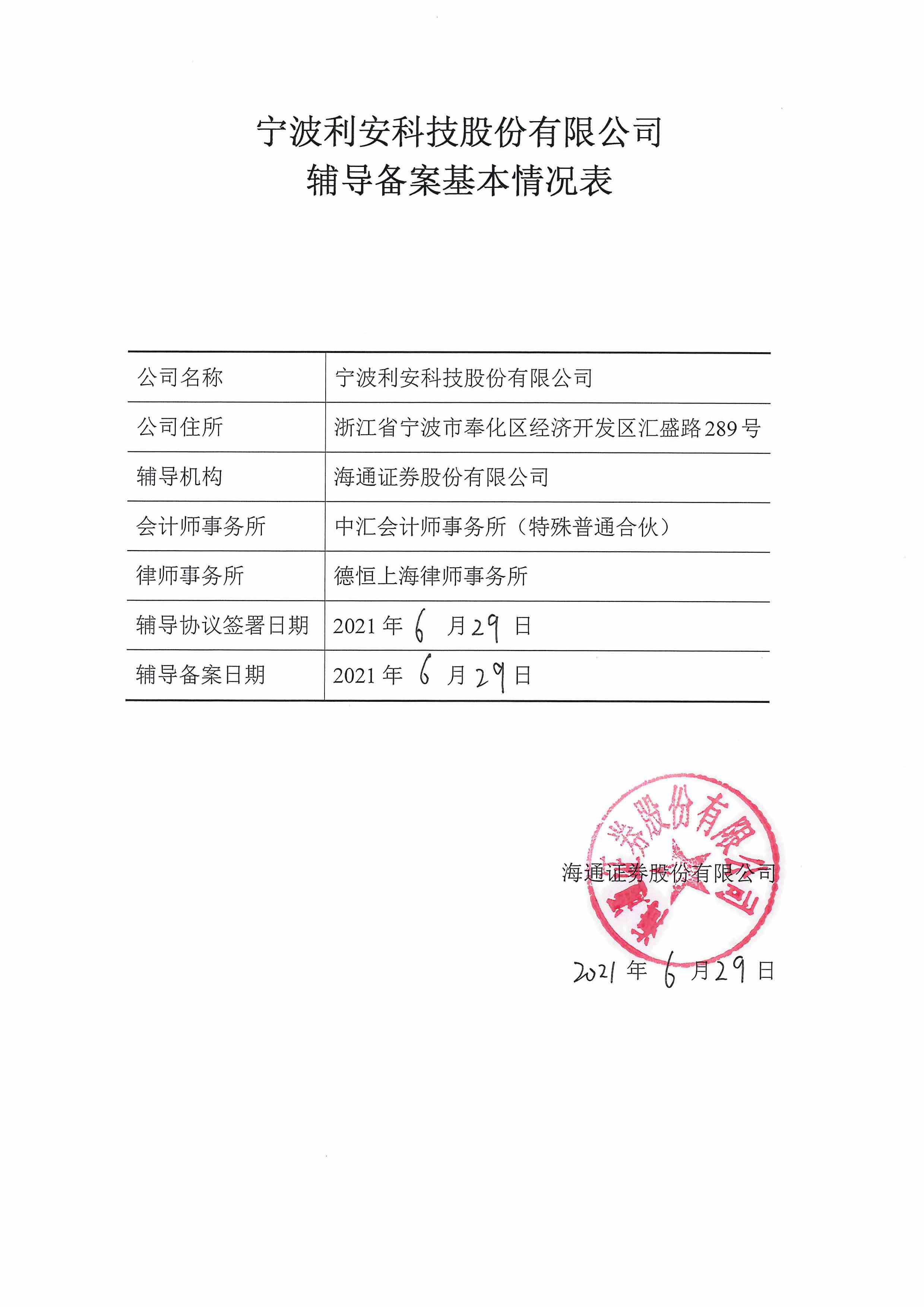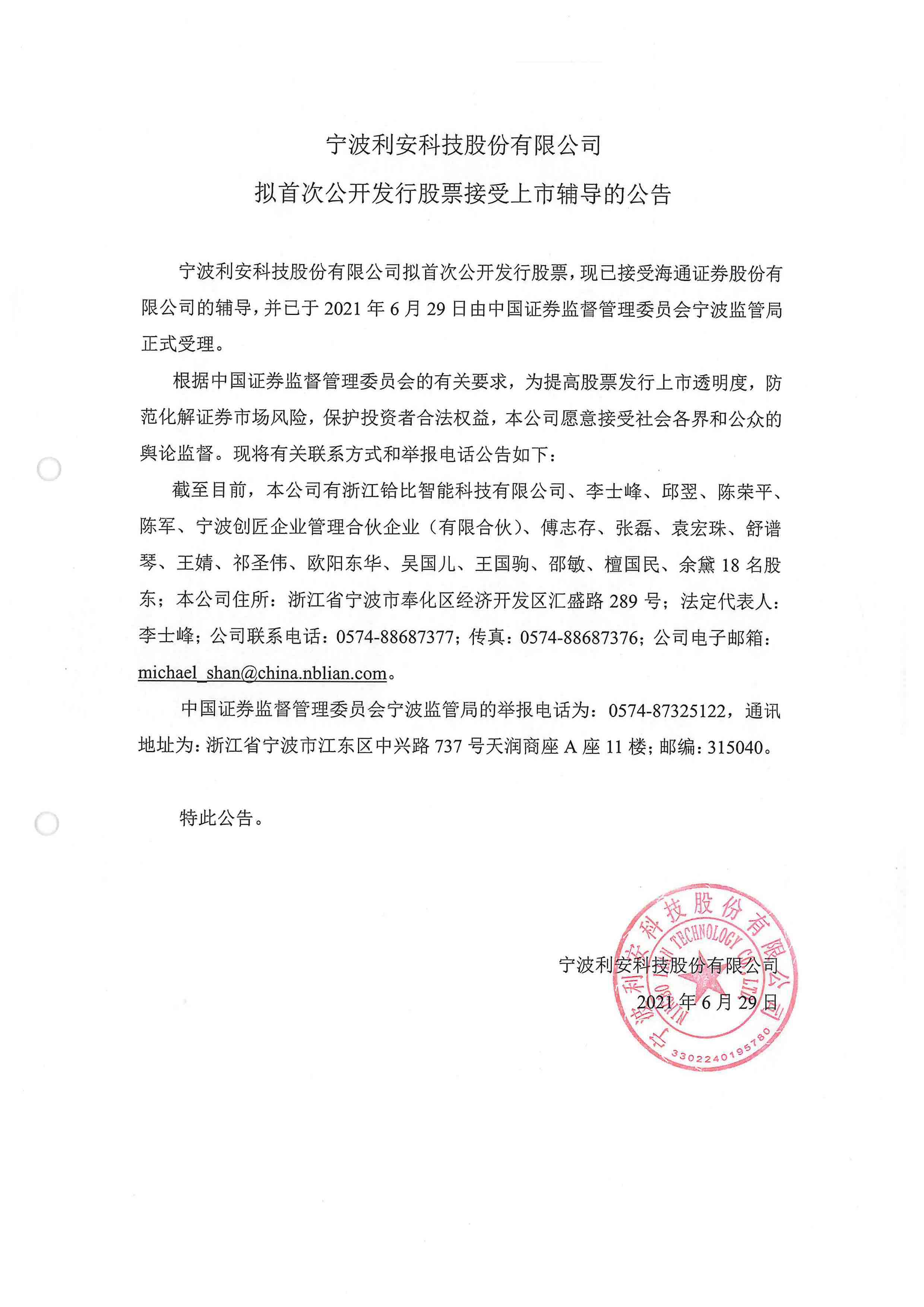 宁波利安科技股份有限公司拟首次公开发行股票接受上市辅导的公告